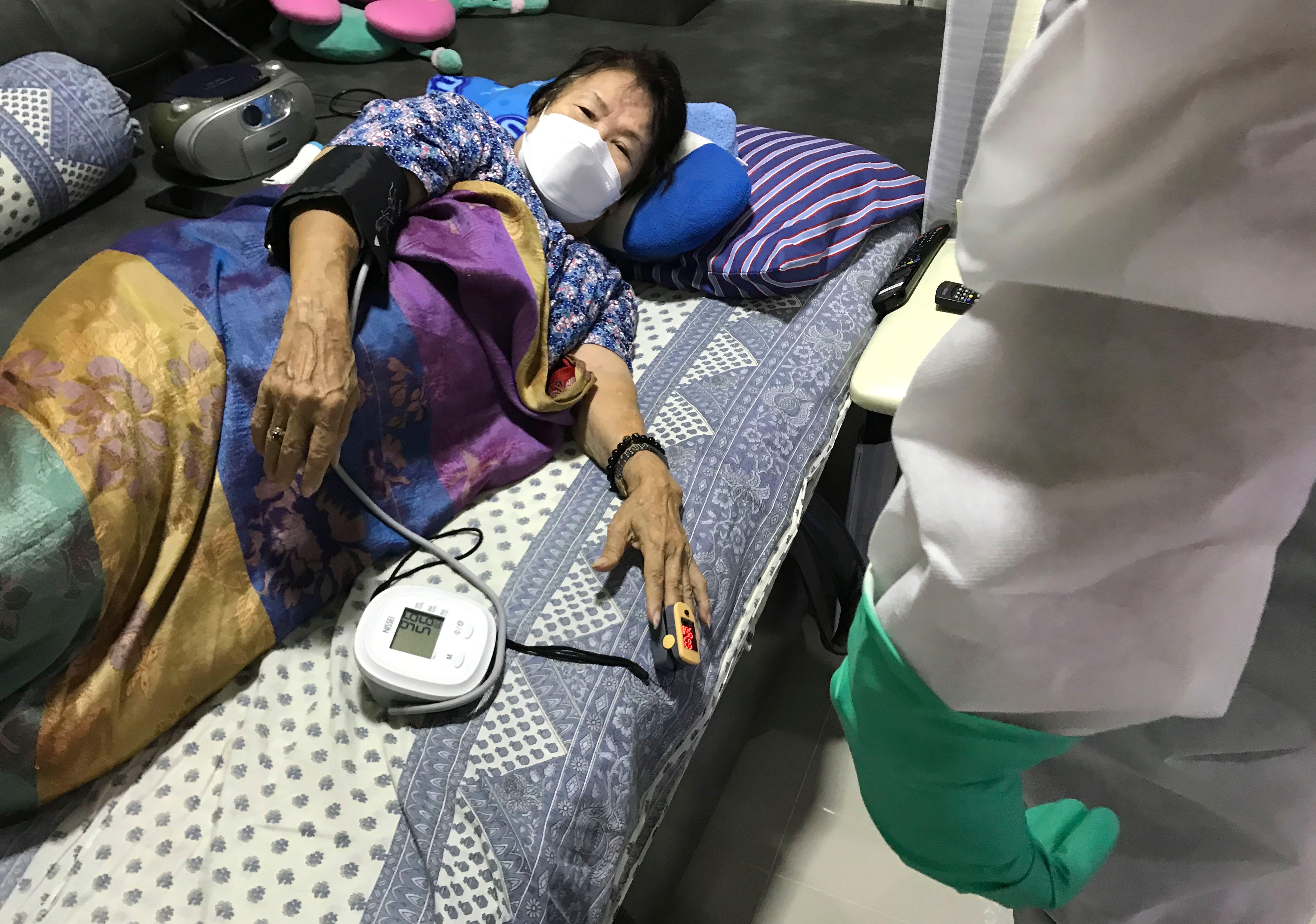A woman feared to have COVID is monitored by a volunteer from the "Saimai Will Survive" group Friday, July 23, 2021, in Bangkok, Thailand. (AP Photo/Tassanee Vejpongsa)