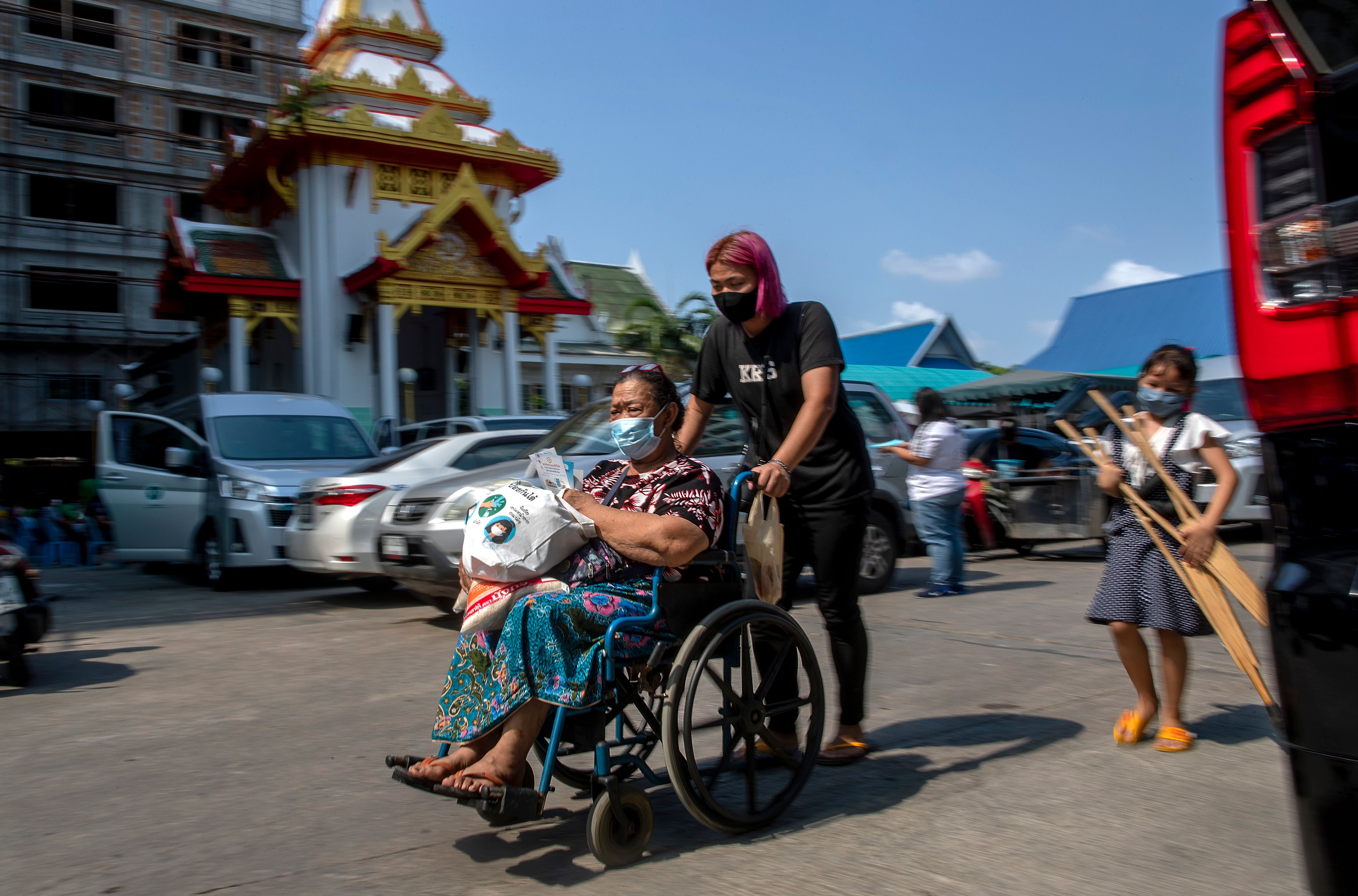 A volunteer pushes a woman in a wheelchair as a child walks behind with her crutches in Bangkok, Thailand, Wednesday, May 6, 2020. (AP Photo/Gemunu Amarasinghe)