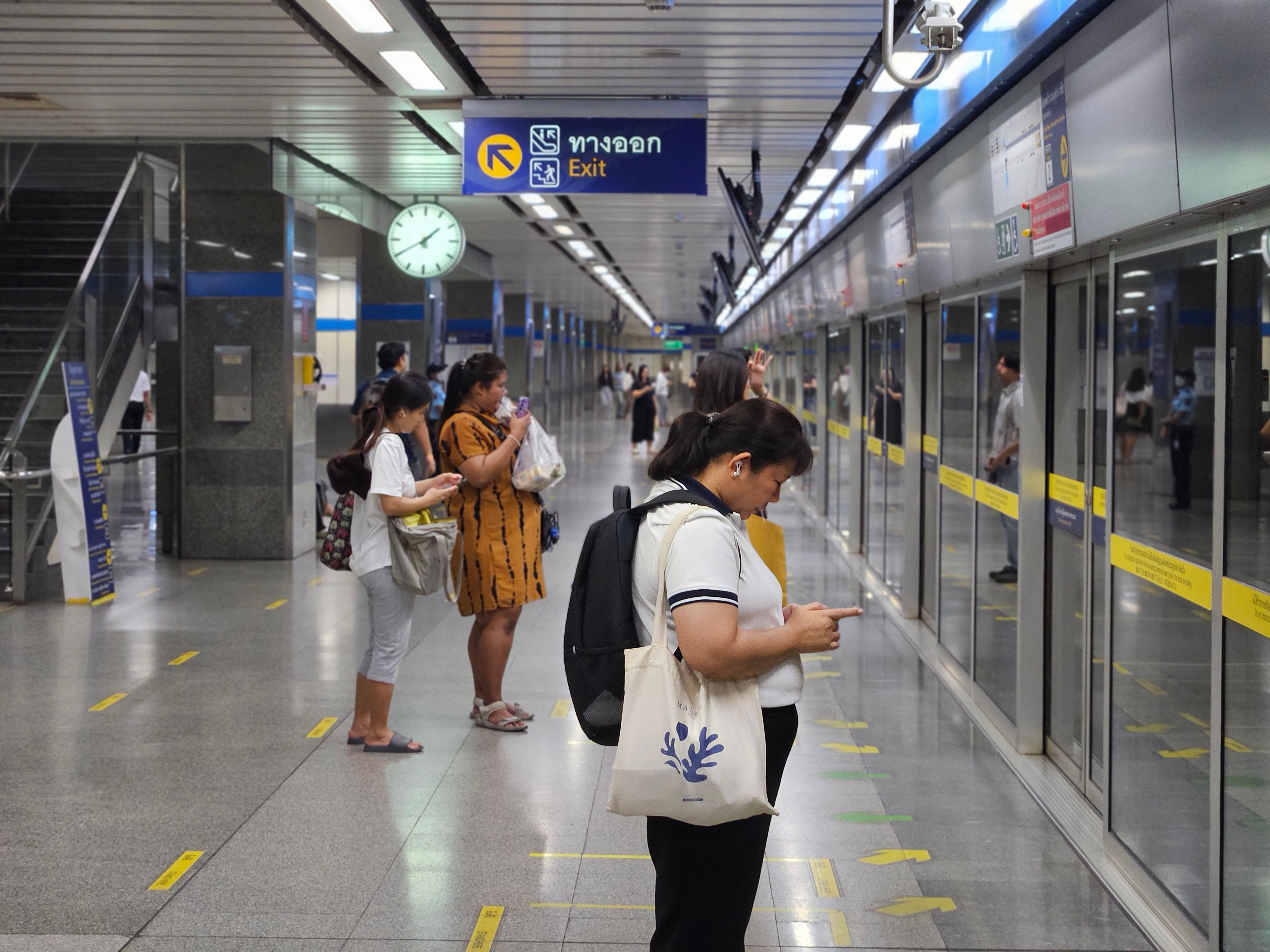 A commuter waits for the Blue Line at Thailand Cultural Center Station Friday, March 6, 2026. (Photo by: Chatwan Mongkol/Soiciety)