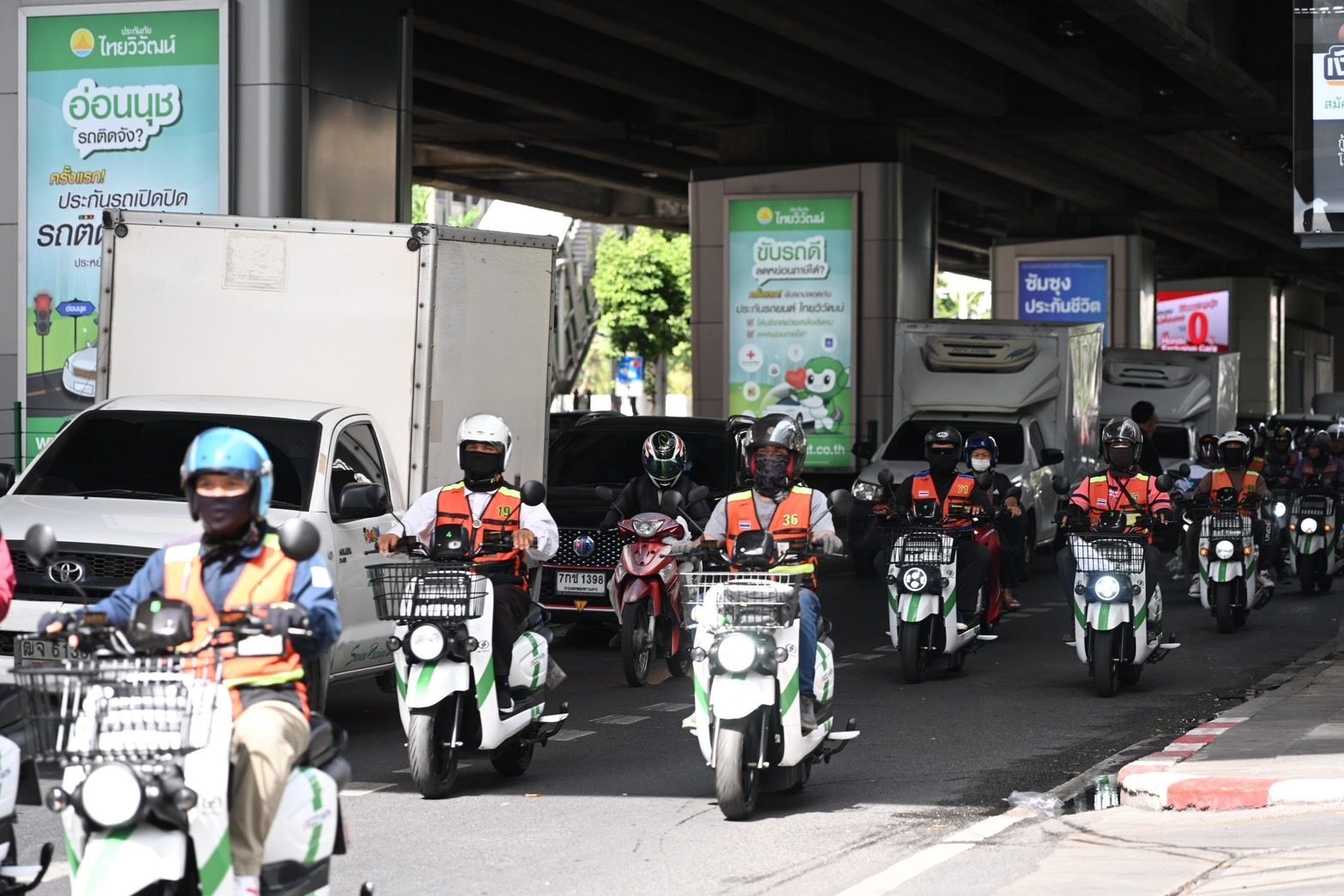 Motorcycle taxi drivers ride their electric scooters near the On Nut station at Sukhumvit 81 in Bangkok in December 2024. (Photo from Bangkok Metropolitan Administration)