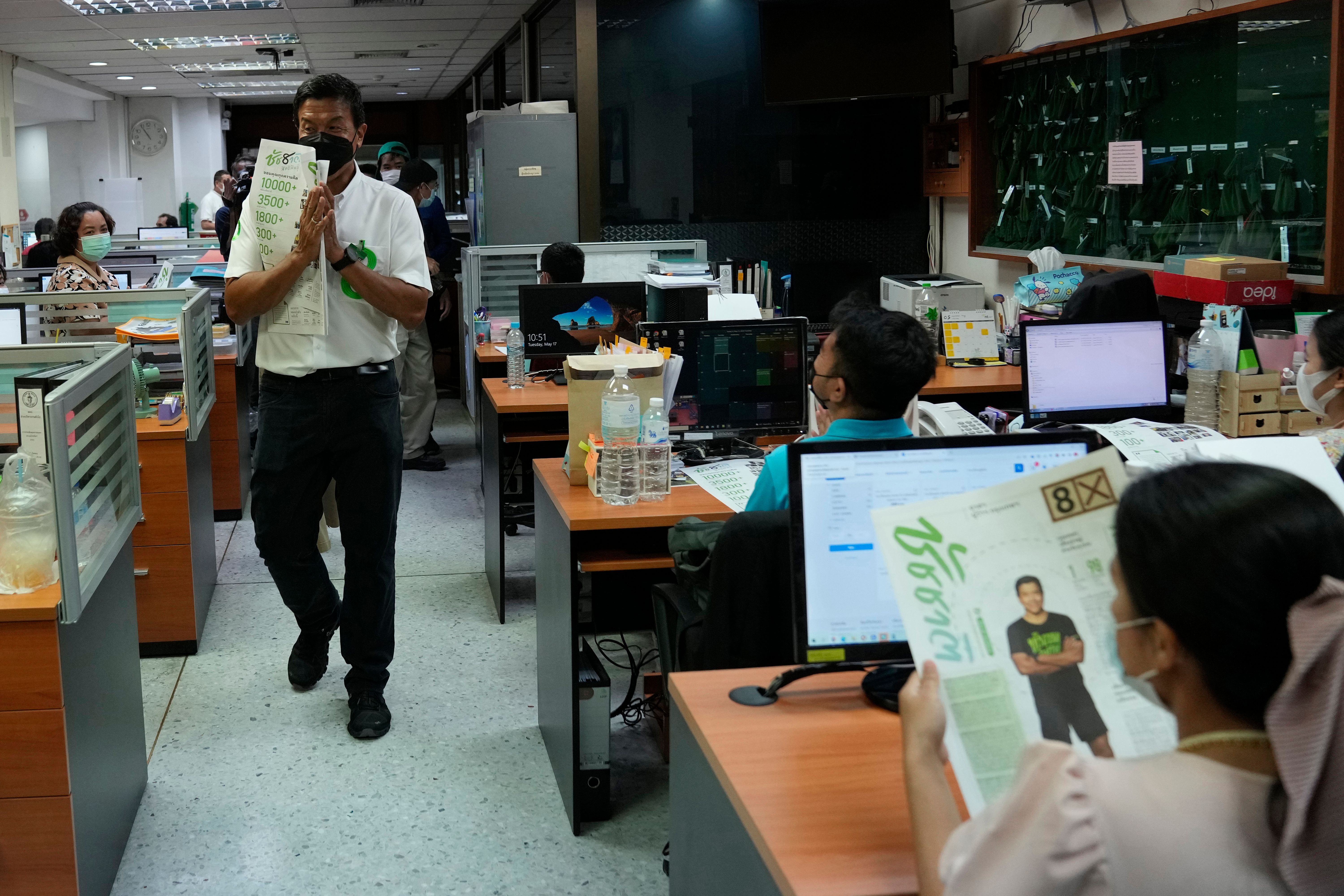 Then Bangkok governor independent candidate Chadchart Sittipunt, left, introduces himself during an election campaign in Bangkok, Thailand, Tuesday, May 17, 2022. (AP Photo/Sakchai Lalit)